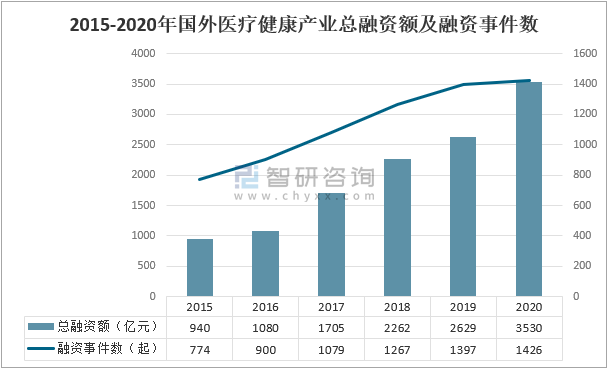 2015-2020年國外醫療健康產業總融資額及融資事件數