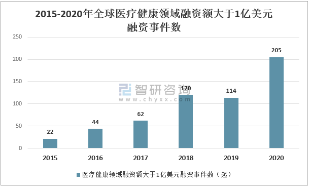 2015-2020年全球醫療健康領域融資額大于1億美元融資事件數