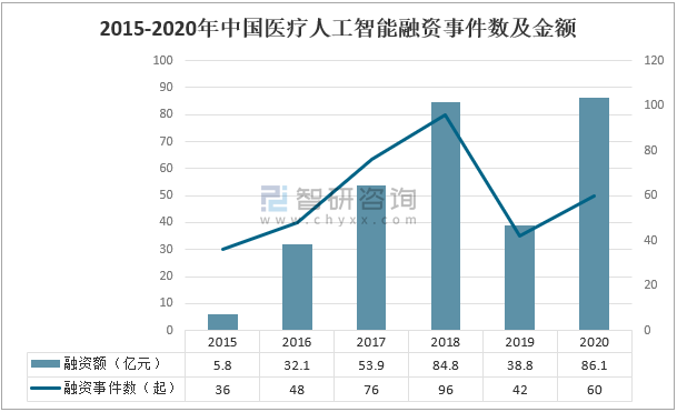 除2019年外中國醫療人工智能融資額一直呈上漲趨勢,2019年醫療人工智能融資事件42次,總金額僅38.8億元;2020年,中國醫療人工智能融資事件發生60起,總融資額86億元,達到歷史新高。