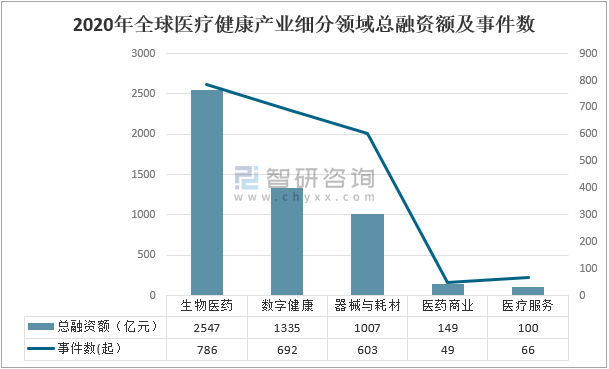 2020年全球醫療健康產業細分領域總融資額及事件數