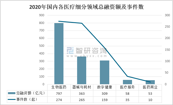 2020年,國內依然是生物醫藥領域領跑交易量和融資額,生物醫藥總融資額797億元,融資事件數274起;器械與耗材總融資額363億元,融資事件數265起;數字健康總融資額309億元,融資事件數159起。