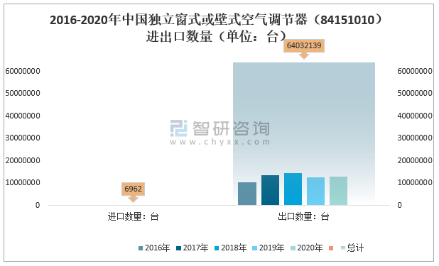 中國是全球最大的空調(diào)出口國。2016-2020年期間,中國獨立窗式或壁式空氣調(diào)節(jié)器(84151010)出口數(shù)量遠遠大于進口數(shù)量,2020年中國獨立窗式或壁式空氣調(diào)節(jié)器(84151010)出口數(shù)量13075534臺,較2019年增長583556臺;而進口數(shù)量704臺,較2019年下降1306臺。