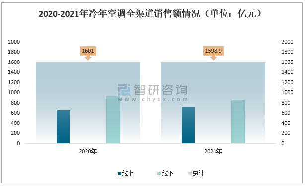 智研咨詢發(fā)布的《2021-2027年中國空調(diào)行業(yè)市場全面調(diào)研及發(fā)展趨勢研究報告》顯示:從近兩年中國冷年空調(diào)全渠道銷售額情況來看,隨著經(jīng)濟水平的發(fā)展,人們的生活水平越來越高,所以空調(diào)銷售也越來越好,2020年中國冷年空調(diào)全渠道銷售額1601億元,其中:冷年空調(diào)線上銷售額662億元,冷年空調(diào)線下銷售額939億元;2021冷年在上新方面有著“獨特”的節(jié)奏,而整體市場表現(xiàn)方面乏善可陳,2021年中國冷年空調(diào)全渠道銷售額1598.9億元,其中:冷年空調(diào)線上銷售額730.7億元,同比增長10.4%,冷年空調(diào)線下銷售額868.2億元,同比下降7.50%。