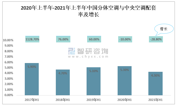 2020年上半年-2021年上半年中國中央空調(diào)配套率及增長