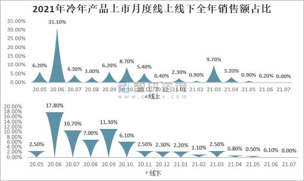 2021年冷年產(chǎn)品上市月度線上線下全年銷售額占比