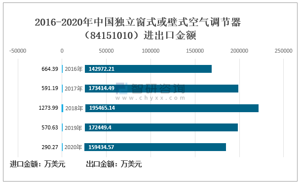 2016-2020年中國獨立窗式或壁式空氣調(diào)節(jié)器(84151010)進出口金額(單位:萬美元)