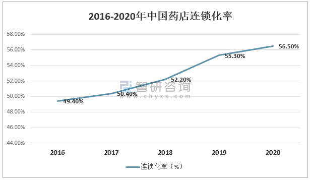 2016-2020年中國藥店連鎖化率
