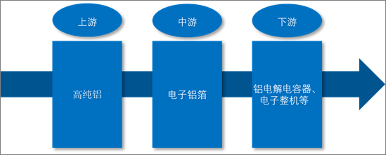 電子鋁箔產業鏈覆蓋上游資源及冶煉(高純鋁的生產);中游電極箔制造(電子鋁箔制造、腐蝕、化成);下游電子元器件制造及消費(鋁電解電容器、電子整機)。