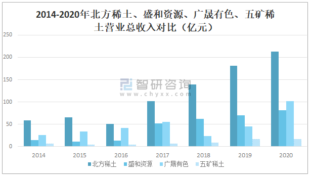 2014-2020年北方稀土、盛和資源、廣晟有色、五礦稀土營業總收入對比(億元)