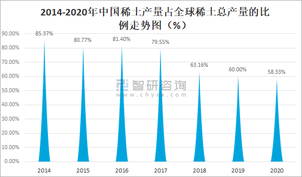 智研咨詢發布的《2022-2028年中國稀土行業競爭戰略分析及市場需求預測報告》數據顯示:稀土既是一種重要的戰略資源,也是中國少有的優勢資源。長時期內,中國稀土的生產量在全球范圍內占據了十分明顯的優勢地位,在世界范圍內的稀土供應和消費都扮演著中流砥柱般的角色。但近年來中國稀土產量占全球稀土總產量的比例呈下滑趨勢,2020年中國稀土產量占全球稀土總產量的58.33%,較2019年減少了1.67%。