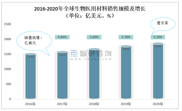 生物醫用材料(BiomedicalMaterials)是用來對生物體進行診斷、治療、修復或替換其病損組織、器官或增進其功能的材料。2016年以來,全球生物醫用材料銷售規模呈增長趨勢,2020年全球生物醫用材料銷售規模1900億美元,同比增長5.10%。