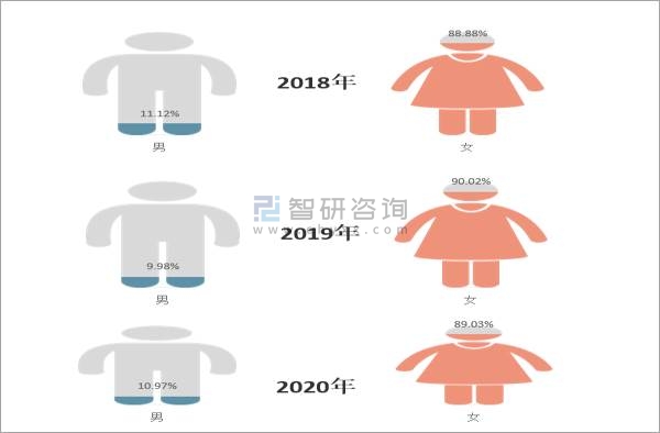 2018-2020年中國醫美消費者男女性用戶占比
