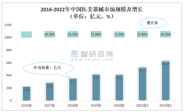 2016-2022年中國醫美器械市場規模及增長