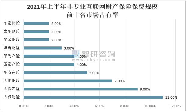 2021年上半年非專業互聯網財產保險保費規模前十名市場占有率