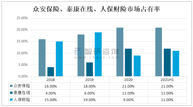 按照上半年互聯網財產保險保費規模排名,前三名為眾安保險、泰康在線和人保財險,市場占有率分別為21%、12%和11%;其中,眾安保險和泰康在線的市場占有率與2020年年底基本持平;人保財險市場占有率較2020年年底提升2個百分點。