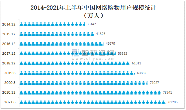 2014-2021年上半年中國(guó)網(wǎng)絡(luò)購(gòu)物用戶規(guī)模統(tǒng)計(jì)