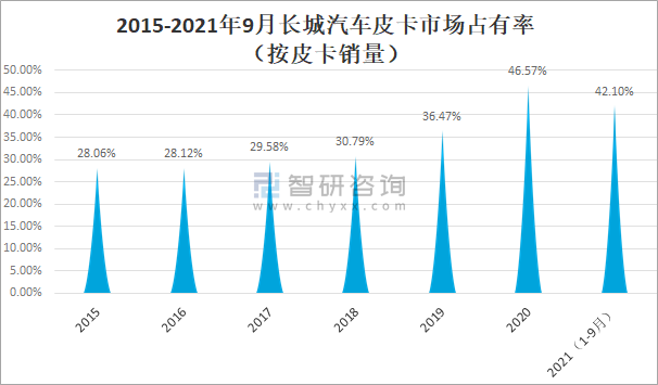 2015-2021年9月長城汽車皮卡市場占有率(按皮卡銷量)