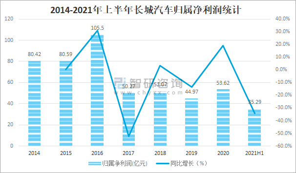從歸屬凈利潤來看,2020年長城汽車歸屬凈利潤達53.62億元,較2019年增加了8.65億元,同比增長19.2%,2021年上半年長城汽車歸屬凈利潤已完成35.29億元。