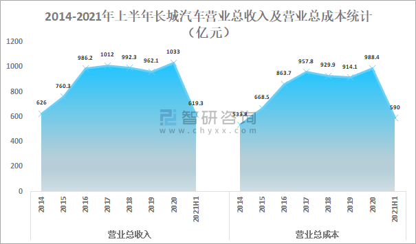 2014-2021年上半年長城汽車營業總收入及營業總成本統計(億元)