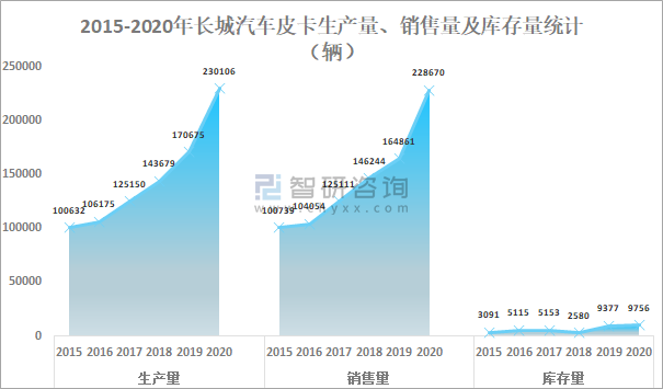 從皮卡生產量、銷售量及庫存量來看,2020年長城汽車皮卡生產量、銷售量及庫存量均保持增長趨勢,2020年長城汽車生產量達230106輛,較2019年增加了59431輛;銷售量達228670輛,較2019年增加了63809輛;庫存量達9756輛,較2019年增加了379輛。