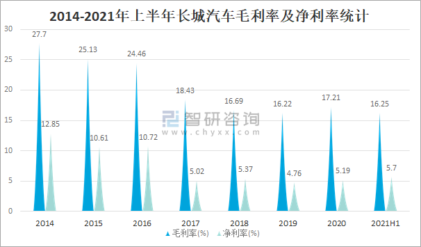 2014-2021年上半年長城汽車毛利率及凈利率統計