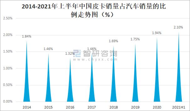 智研咨詢發布的《2021-2027年中國皮卡行業市場需求與投資戰略規劃分析報告》數據顯示:自2017年起中國皮卡銷量占汽車銷量的比例逐年攀升,2020年中國皮卡銷量占汽車銷量的1.94%,較2019年增長了0.19%,2021年上半年中國皮卡銷量占汽車銷量的比例繼續保持增長,2021年上半年中國皮卡銷量占汽車銷量的2.10%。