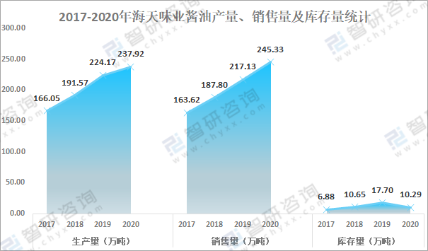 從醬油產量、銷售量及庫存量來看,近年來海天味業醬油產銷量雙增長,2020年海天味業醬油生產量達237.92萬噸,較2019年增加了13.75萬噸;銷售量達245.33萬噸,較2019年增加了28.20萬噸;庫存量為10.29萬噸,較2019年減少了7.40萬噸。