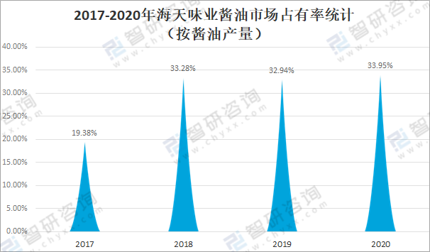 從醬油市場占有率來看,自2018年起海天味業占據中國醬油市場三成以上的比例,2020年海天味業醬油產量占全國醬油總產量的33.95%,較2017年的19.38%增長了14.57%。