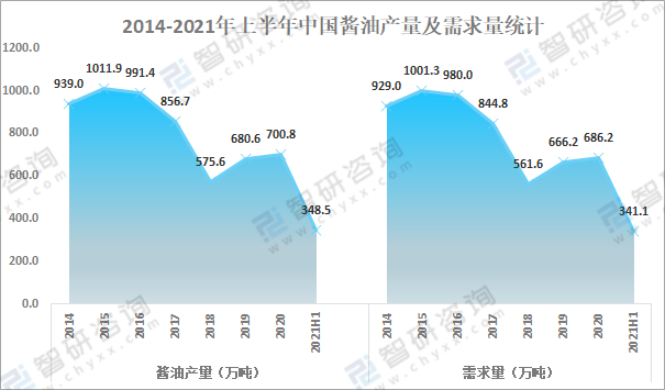 醬油是在我國周朝時期就生產的一種調味品,歷史悠久,是傳統的調味佳品,在調味品中占有重要地位,隨著人們整體生活水平的日益提升,我國醬油銷量逐漸增加,2021年上半年中國醬油產量為348.5萬噸,需求量為341.1萬噸,中國醬油產量大于銷量,部分產品主要用于出口。