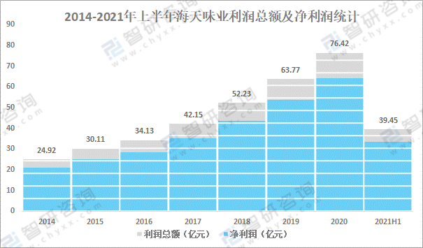 隨著營業收入的增加,利潤總額也隨之增長,2020年海天味業利潤總額達76.42億元,較2019年增加了12.65億元,同比增長19.8%,2021年上半年海天味業利潤總額已完成39.45 億元,其中凈利潤為33.55億元。