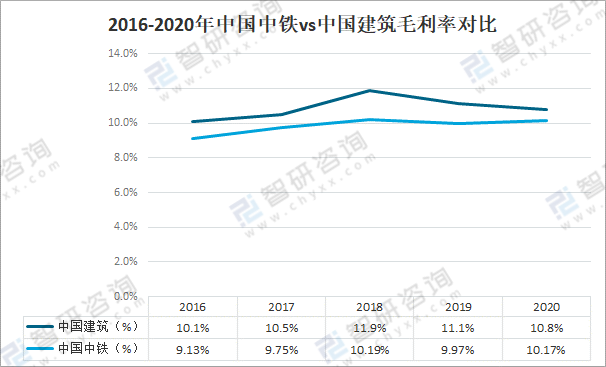從毛利率來看,2020年,中國中鐵實現毛利率10.17%,毛利率比上年增加0.20個百分點;中國建筑實現毛利率10.8%,與上年同期相比降低0.3個百分點。