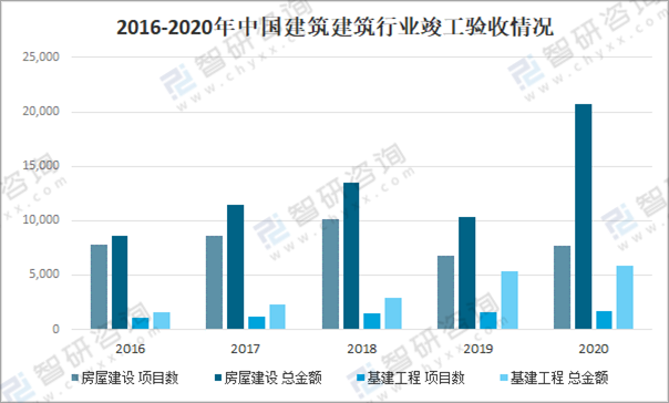 中國建筑建筑行業竣工驗收情況來看,2020年,中國建筑建筑行業竣工驗收項目數9338個,總金額26647億元;其中,房屋建設項目數7677個,總金額20740億元;基建工程項目數1661個,總金額5907億元。