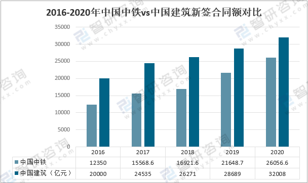 從營業總收入來看,2020年,中國中鐵多項業績指標連續創歷史最好水平,營業總收入9747億元,較上年增加1239億元,同比增長14.56%;中國建筑經營情況持續健康平穩發展,完成營業收入16150億元,較上年增加1952億元,同比增長13.7%。