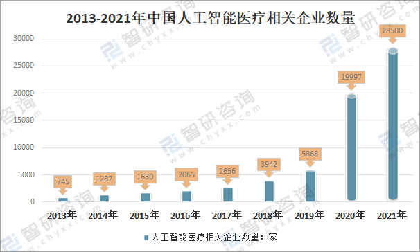 智研咨詢發布的《2022-2028年中國醫療人工智能行業投資策略探討及市場規模預測報告》顯示:在國家政策支持、技術發展和市場需求的共同推動下,我國人工智能醫療產業近年來迅猛發展,各大企業及越來越多的醫療AI初創企業紛紛加大人工智醫療產業,2013年以來,中國人工智能醫療相關企業數量呈直線增長趨勢,截止2021年10月26日,中國人工智能醫療相關企業數量達到28500家,可以看出人工智能醫療的熱度提升明顯。