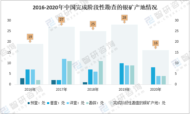 2019年中國完成階段性勘查的銀礦產(chǎn)地28處,較2018年增長3處,其中:普查10處,詳查9處,勘探9處;2020年中國完成階段性勘查的銀礦產(chǎn)地16處,較2019年減少12處,其中:普查8處,詳查4處,勘探4處。
