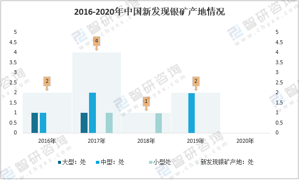 2016年中國新發(fā)現(xiàn)銀礦產(chǎn)地2處,其中:大型1處,中型1處;2017年中國新發(fā)現(xiàn)銀礦產(chǎn)地4處,其中:大型1處,中型2處,小型1處;2018年中國新發(fā)現(xiàn)小型銀礦產(chǎn)地1處;2019年中國新發(fā)現(xiàn)中型銀礦產(chǎn)地2處;2020年沒有新發(fā)現(xiàn)銀礦產(chǎn)地。