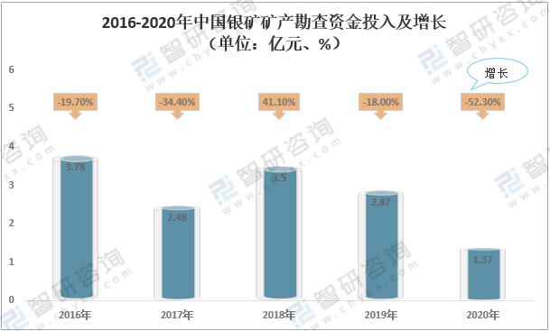智研咨詢發(fā)布的《2022-2028年中國銀礦行業(yè)市場發(fā)展前景及投資風(fēng)險評估報告》顯示:地質(zhì)勘查工作的開展離不開資金的支持,近幾年,我國銀礦勘查投入規(guī)模持續(xù)下行。2020年中國銀礦礦產(chǎn)勘查資金投入1.37億元,同比下降52.3%。