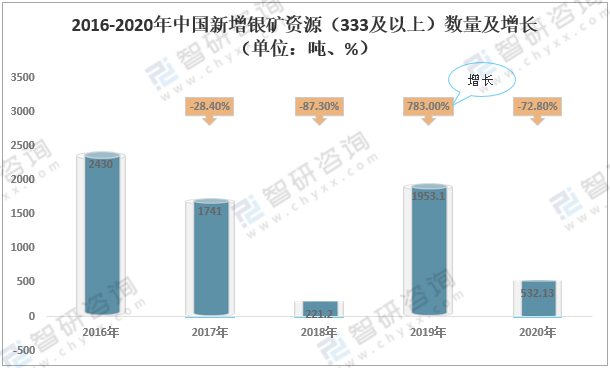 2016-2020年中國新增銀礦資源(333及以上)數(shù)量及增長(單位:噸、%)