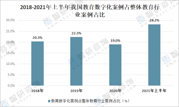 2018-2021年上半年我國教育數字化案例占整體教育行業案例占比