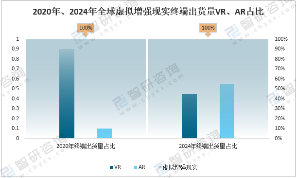 2020年、2024年全球虛擬增強現(xiàn)實終端出貨量VR、AR占比