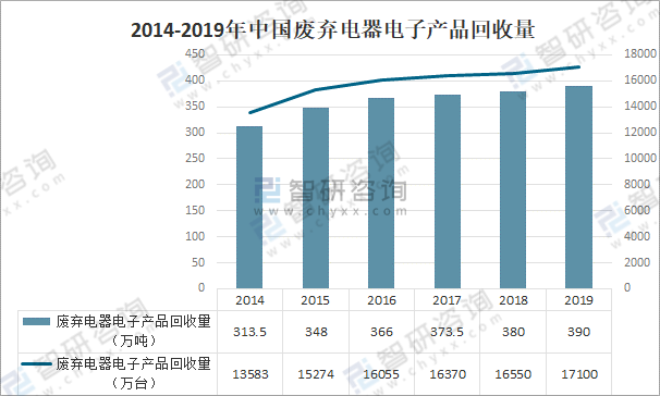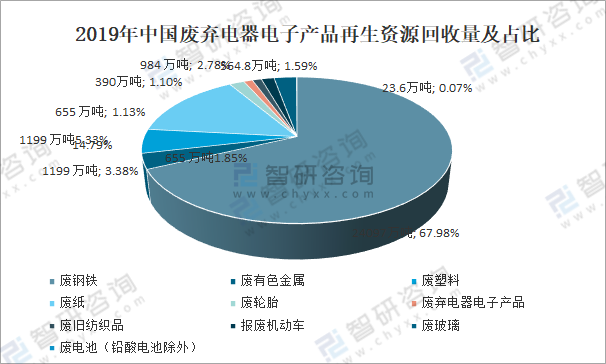 據商務部數據,2019年中國廢棄電器電子產品再生資源回收數量為390萬噸,占總再生資源產品的1.1%。