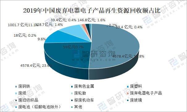 據商務部數據顯示,2019年中國廢棄電子電器產品再生資源回收金額為128.7億元,占總再生資源產品的1.4%。