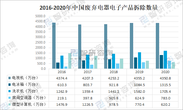 《廢棄電器電子產品處理目錄(第一批)》包括電視機、電冰箱、洗衣機、房間空調器及微型計算機五類產品。2020年中國電視機拆除數量約為4350.8萬臺,同比下降0.1%;報廢電冰箱拆除數量約為1315.5萬臺,同比增長21.3%;洗衣機拆除數量約為1705.4萬臺,同比增長7.8%;房間空調器拆除數量約為783萬臺,同比增長25.3%;微型計算機拆除數量約為620.2萬臺,同比下降19.5%。