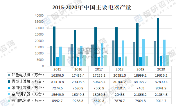 2015-2020年中國主要電器產量