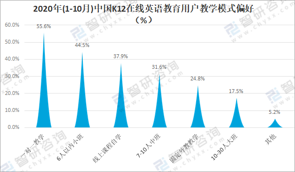 2020年(1-10月)中國K12在線英語教育平臺用戶教學模式偏好中,一對一教學能夠使學生得到教師高度關注和針對性教學,有55.6%的用戶選擇。此外,44.5%的用戶選擇6人以內小班,37.9%的用戶選擇線上課程自學,31.6%的用戶選擇7-10人中班,24.8%的用戶選擇固定外教教學,17.5%的用戶選擇10-30人大班。