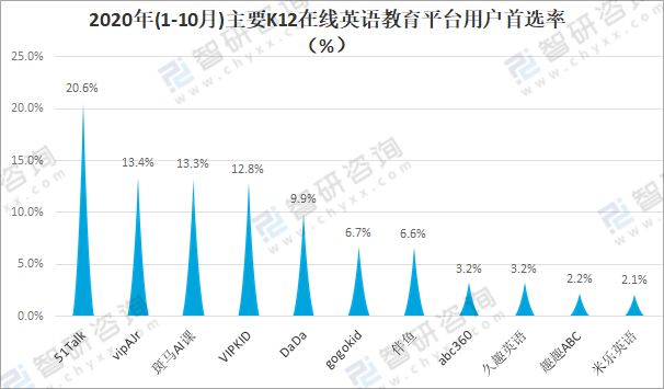 2020年(1-10月)主要K12在線英語教育平臺用戶首選率