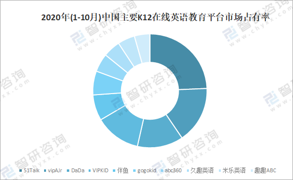 2020年(1-10月)中國主要K12在線英語教育平臺市場占有率方面,51Talk市場占有率居榜首,其次是vipAJr、DaDa、VIPKID、伴魚、Gogokid、abc360、久趣英語、米樂英語、趣趣ABC。