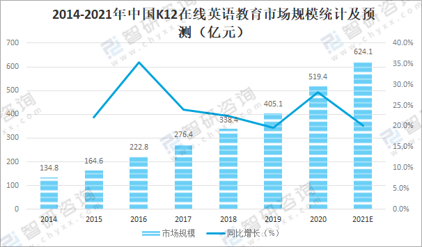 隨著互聯網技術的不斷發展,“互聯網+”的紅利自然不能略過教育行業,人們已經不再滿足線下優質的受教育需求。特別是二胎政策的開放,升學壓力持續增大,滿足用戶碎片化學習K12在線教育開始受到廣泛關注,行業規模也在持續擴大,2020年新冠疫情使得全國中小學生普遍在家通過互聯網上課,趁著這股東風,我國K12在線英語教育市場規模逆勢增長,2020年中國K12在線英語教育市場規模達519.4億元,較2019年增加了114.30億元,同比增長28.2%,預計2021年中國K12在線英語教育市場規模將達到624.1億元。