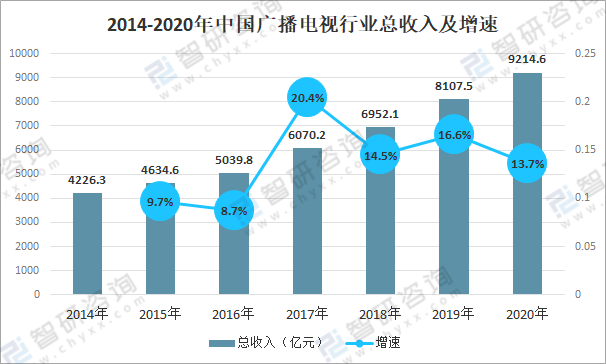 2014-2020年中國廣播電視行業總收入及增速