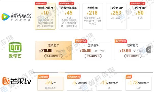 騰訊視頻VS愛奇藝VS芒果TV會員價格